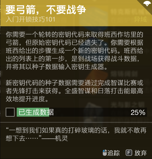 随后班西44需要我们通过先锋打击或者智谋比赛来生成密钥数据。这里推荐大家直接打全盛智谋,这是最快的。4把全盛智谋就可以累计完进度。而日落打击虽然只需要两把,但是对于萌新来说,野队水平很不稳定,如果过不了关重来就很亏了。