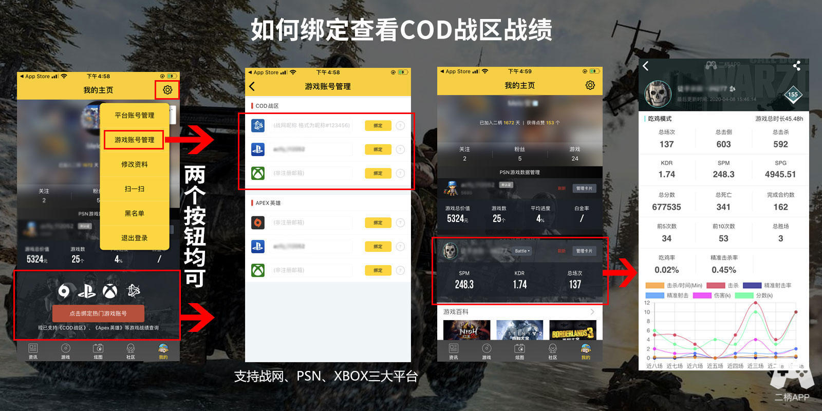 二柄APP现已提供《COD 战区》战绩查询,支持全部三大平台(战网、PSN、XBOX)战绩同步,包括个人战区模式总数据及最近比赛数据、最近比赛中所有玩家数据等。大家可以通过首页“我的”页面点击右上角设置按钮,进入“游戏账号管理”,绑定战区账号后可正常查询,初次载入可能需要耐心等待。(具体步骤见配图)