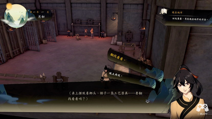 略过只有一个选项,全程打酱油的第一幕,我们从机关房开始,短暂的小剧情,加加特质,开始接到第一个事件。在接受这个破游戏梆硬的操作之后,我们控制人物,来到床边调查(E),获得金钱若干,往下来到工作台,调查,获得乌漆?我忘了。