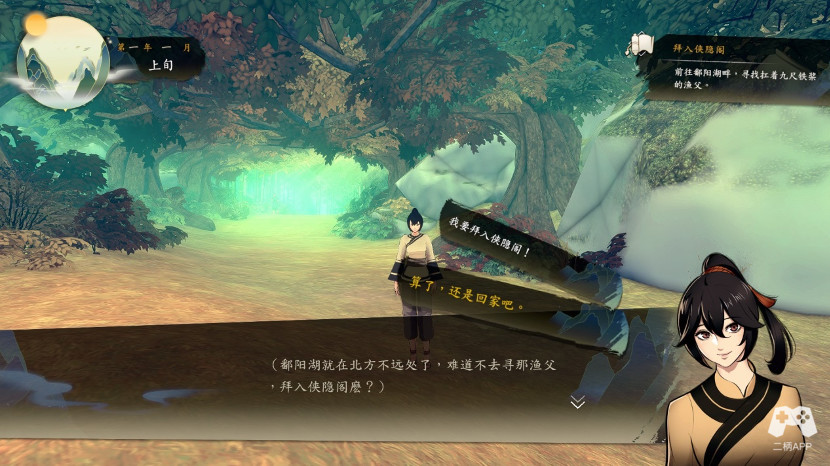 接下来准备拜入侠隐阁,接下来往回走,出现下图选项。回家