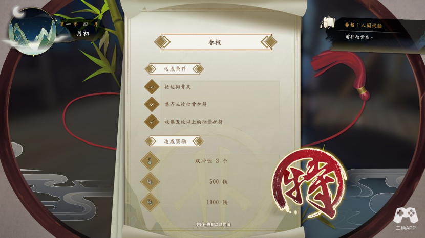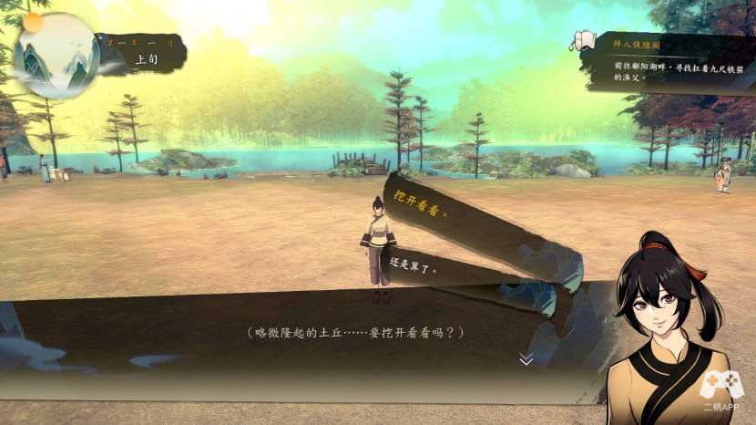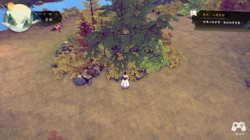 回到弟子社区,我们去山道,第一次过剧情,随便选,我觉得影响不大,不过一条线走到黑吧,剧情过完,再进一次,在地图左上草丛,调查,获得礼物玉佩*1?