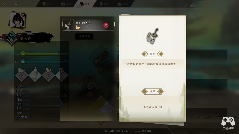 朝河边直走,和书生对话,告诉拜入侠隐阁,得到谜题,右拐,调查木筏旁的草丛,获得破旧香包*1.第一个装饰品获得。
