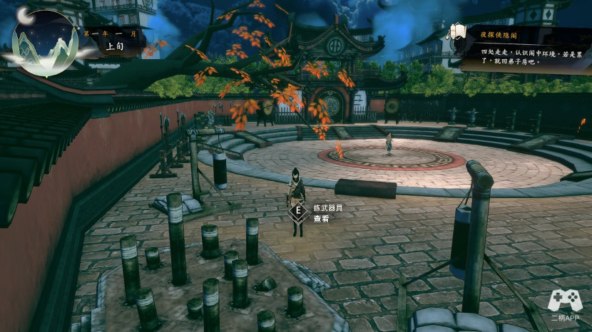 去小径,到达练功场,首先去地图左下角。调查,获得双冲饮。
