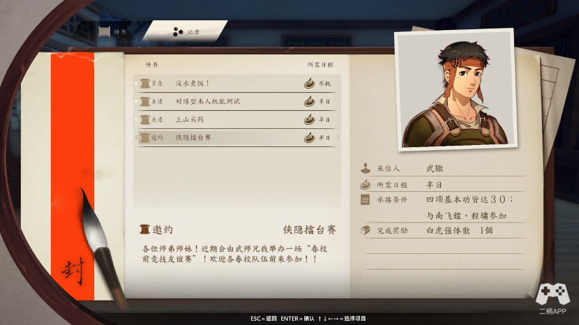 2. 队友的选择与培养:三月初进行剧情,你会遇到傲娇的官方男配和选择春校的组队伙伴,其实你只有俩种选择~妹子队和汉子队,这个接下来会说明,凭自己喜好,然后培养他们,其实就是增加好友度。另外三月初剧情胜利,获得装备踏云靴,这个我个人认为是神器~~滑稽。其中段和程只能到2阶段,但是我们的直男酒鬼和钟妹子却能到3阶段,其中飞蝗兄(需要90爽朗)钟妹子应该是90胆识吧,猜的,但是有牺牲时间,看你怎么取舍了,我建议到3阶段,然后参加传书~新生擂台赛。4阶段(需要150坚毅,另外有点难度,我是后期打的,还读过一次档)虽然没有卡但时间肯定不够,别想了。