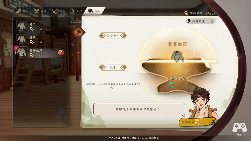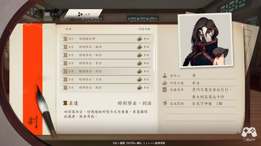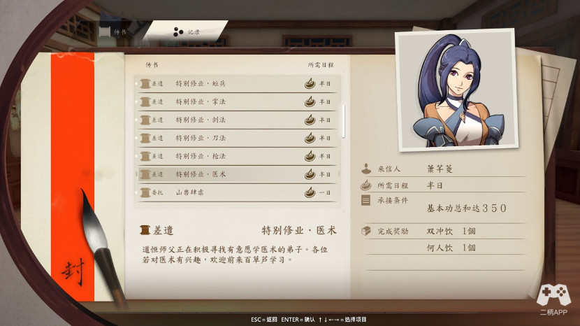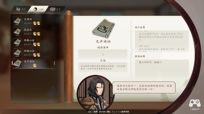 随后日子过度到八月初剧情,你会选择一门修业,这时候暗器修业开启,你可以找宁师傅学习暗器了。或者选择进阶修业,我个人不是太推荐,因为加上特别修业的招式,你技能槽应该满了。所以再选择一项,并不能增加什么。而且那个技能我看着,也就都一般,棍法短兵看着还可以吧,不过没练,没具体数值参考。