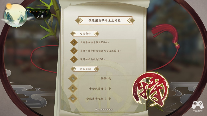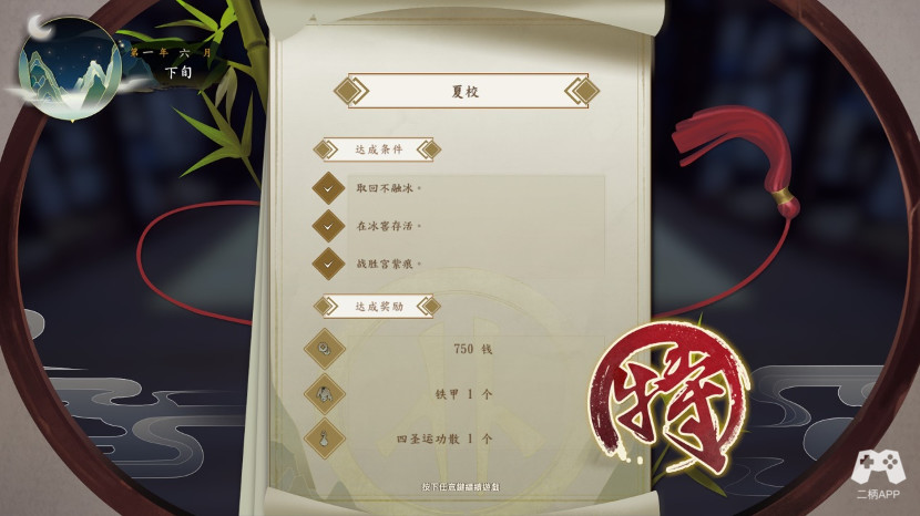 夏季测试结束,也宣告着游戏第一年已经进行一半了,这时候如果你参加了特别修业,那么下卷的招式会对你开放,另外也会多4本心法,这些靠你自己筛选。
