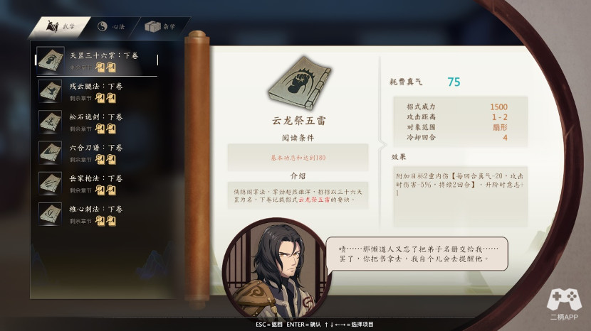 随后去画处,找个没存在感的弟子,用画换一门范围技能:五丁开山,但是如果你特别修业刀法做了就会给你换成柳叶刀*1。