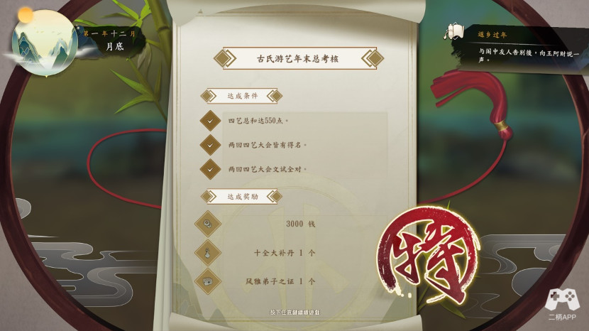 然后出门回家,萧师姐会过来对话,达标,可对自己的四艺进行升级。四艺中阶。随后开始过剧情,为了夏季做准备。