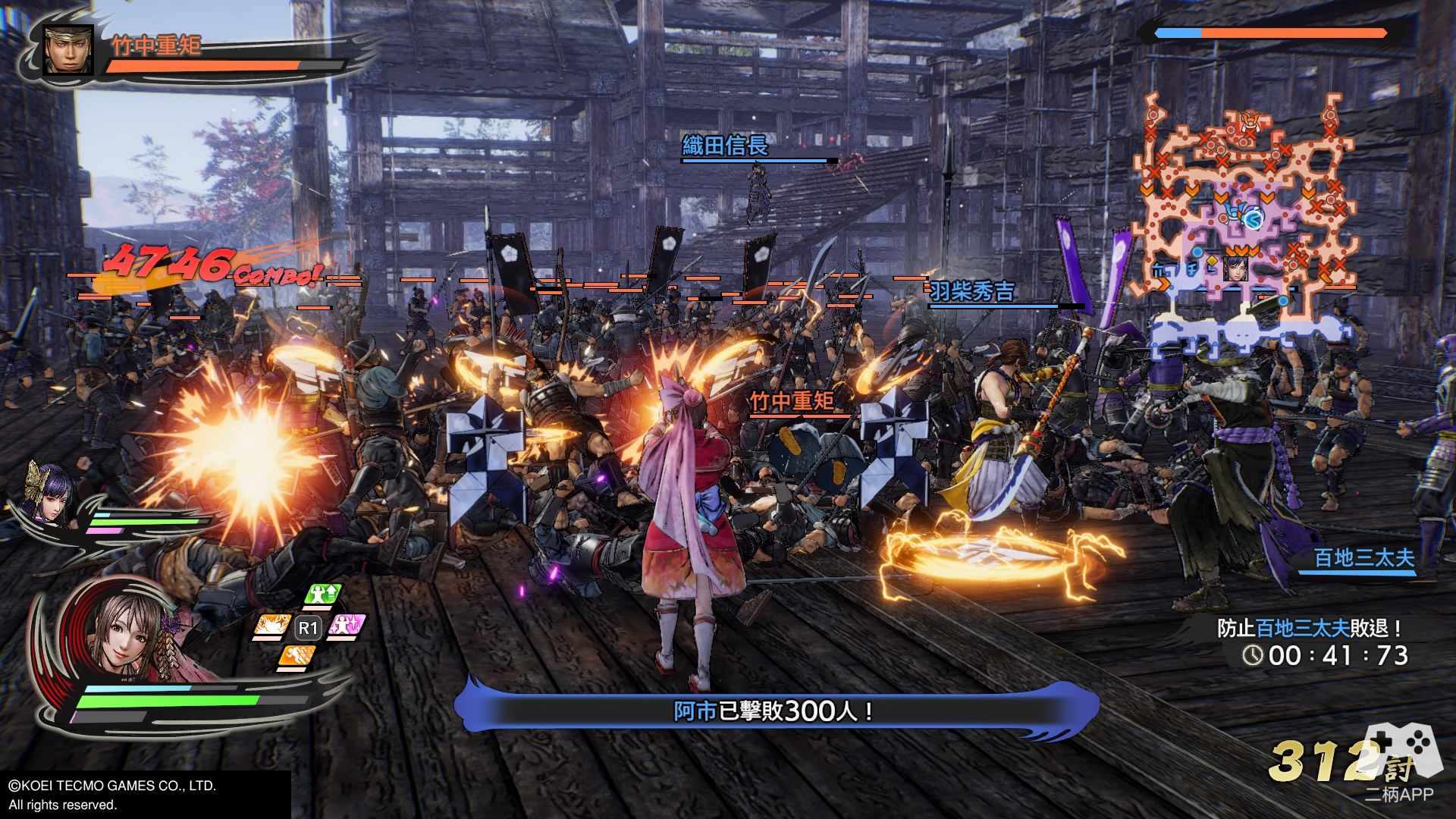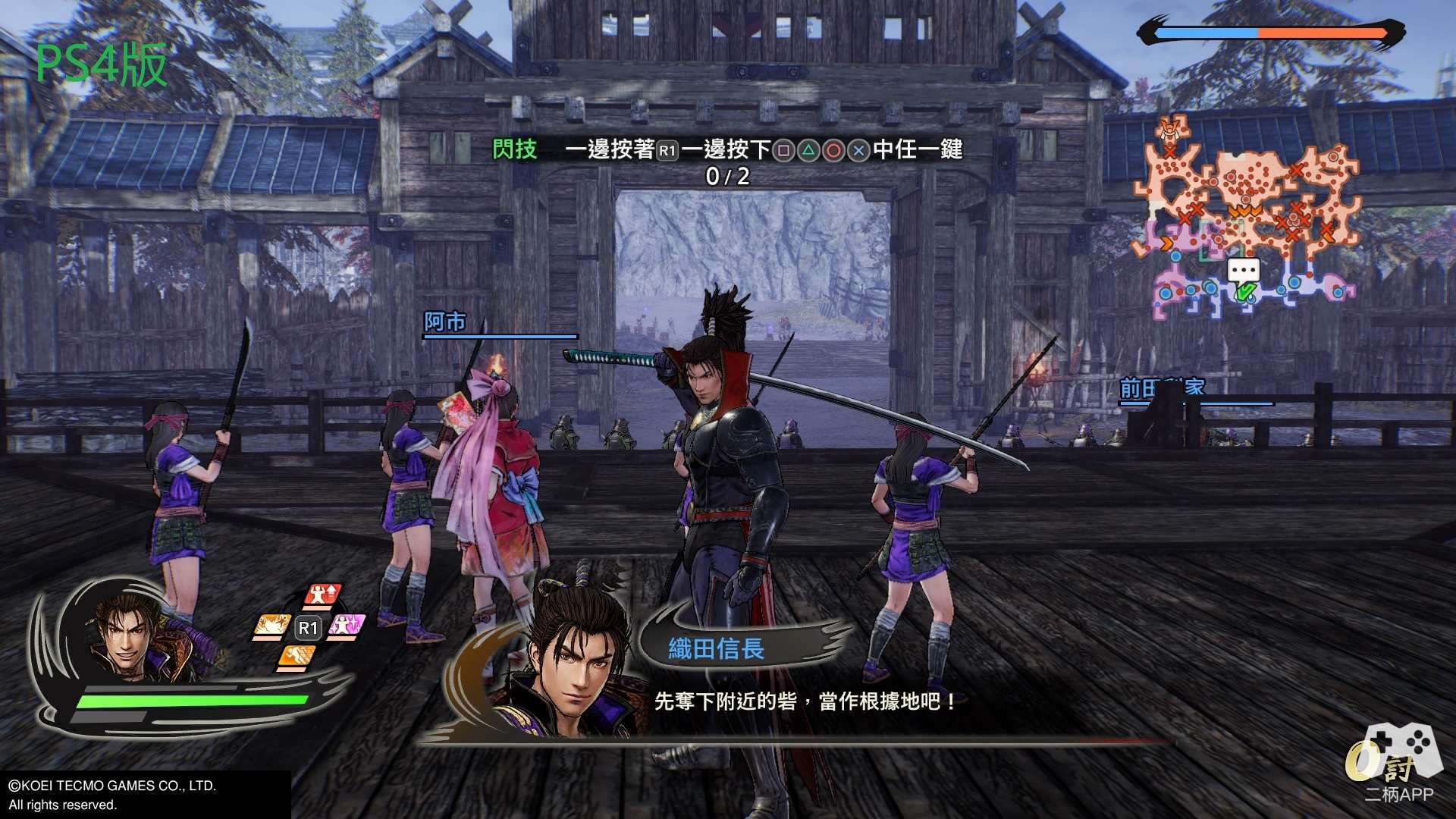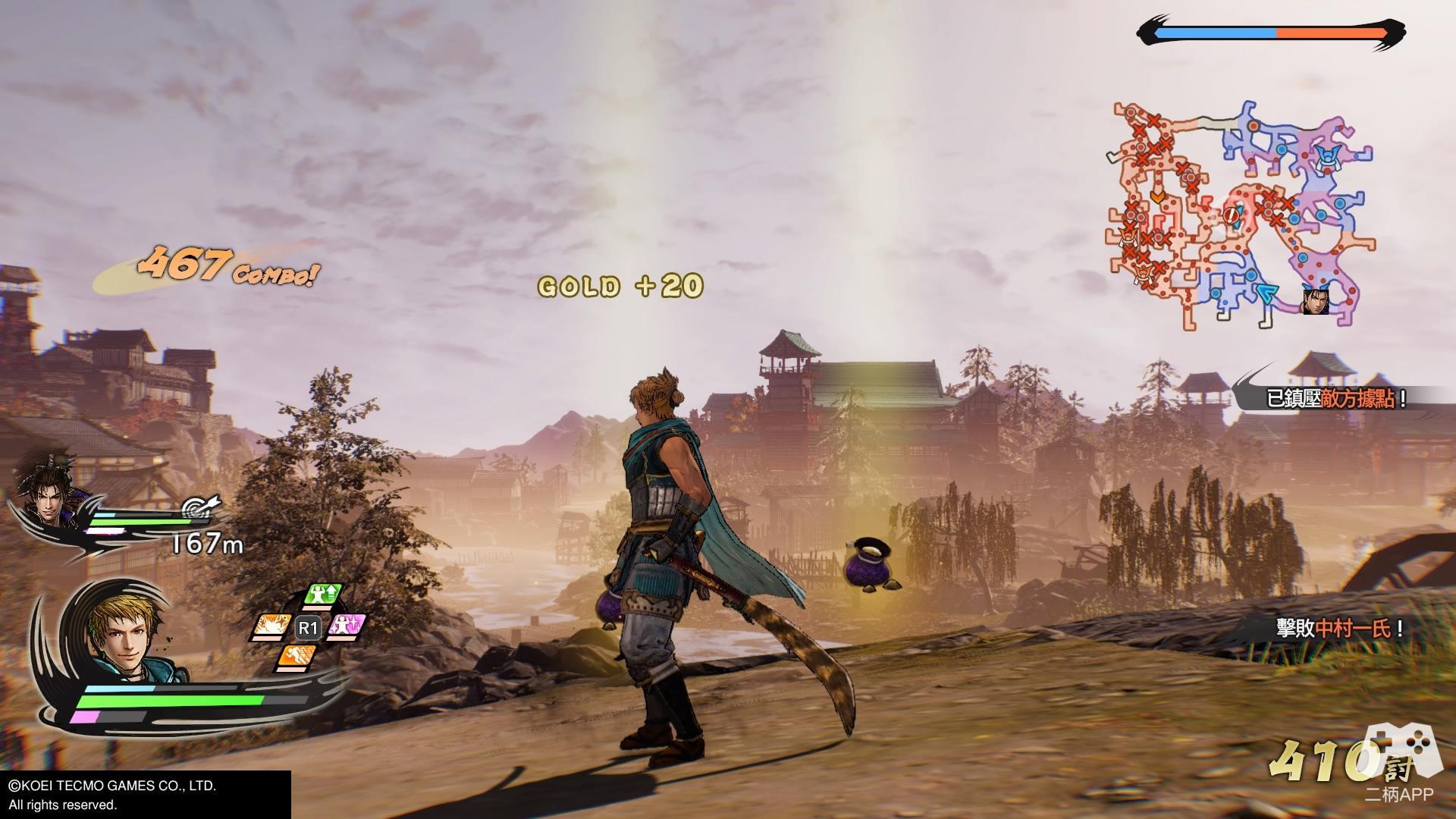 游戏的战斗一如既往的“爽快”!!! 整体战斗风格延续了无双系列传统的“C技”连段模式,前作好评的“神速”系统有保留下来,虽然没有之前那么BUG,不过后续可接普攻或C技,无论是清杂兵还是作为追combo的手段都十分好用。新增加的“闪技”也很好的取代了前作的道具系统(R键集合右边四个按键使用,笔者第一反应是Basara中的固有技),虽然闪技有着CD冷却时间,不过与其他攻击手段配合使用依旧有着不错的效果。此外,通过连击蓄满“练技槽”后可开启极意模式,在该状态下释放皆传无双有角色的特写,虽然类型不同,但还是让人有种和P5放完必杀那般的异曲同工之妙,结合新画风不仅让人眼前一亮也更让爽快度再度提升。