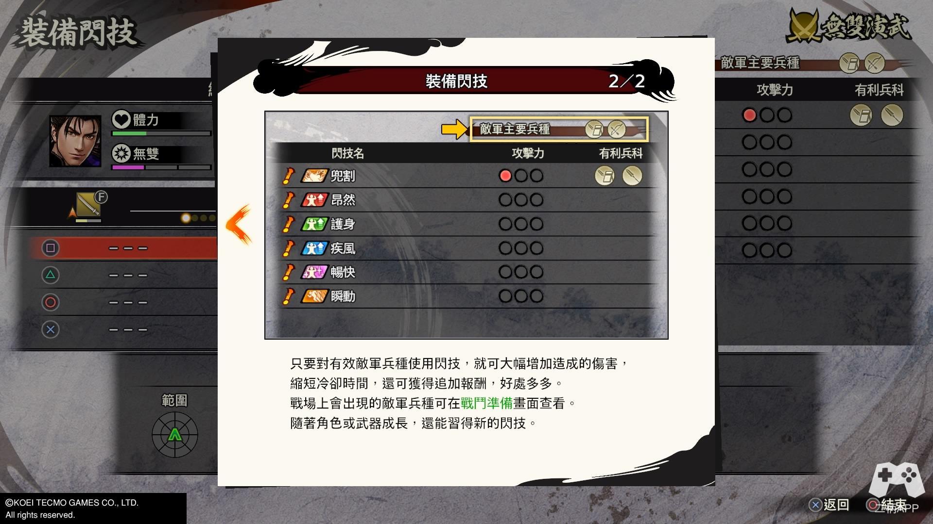 游戏中的敌方兵种(盾兵,枪兵,弓/火枪兵,骑兵,阴阳师等等)作用在本作中会有略微的加强,也得益于闪技的加入,如盾兵,枪兵这种用克制闪技击杀会比较方便,不过因为有CD的限制,还是有些要C技清理或跑路。这里需要注意的是,“神速” 不要对盾兵,枪兵使用,会出现很大硬直,碰到在地上的武将也会,所以对武将的话需要C技或连段将敌人击飞/浮空后使用神速追击会比较好。