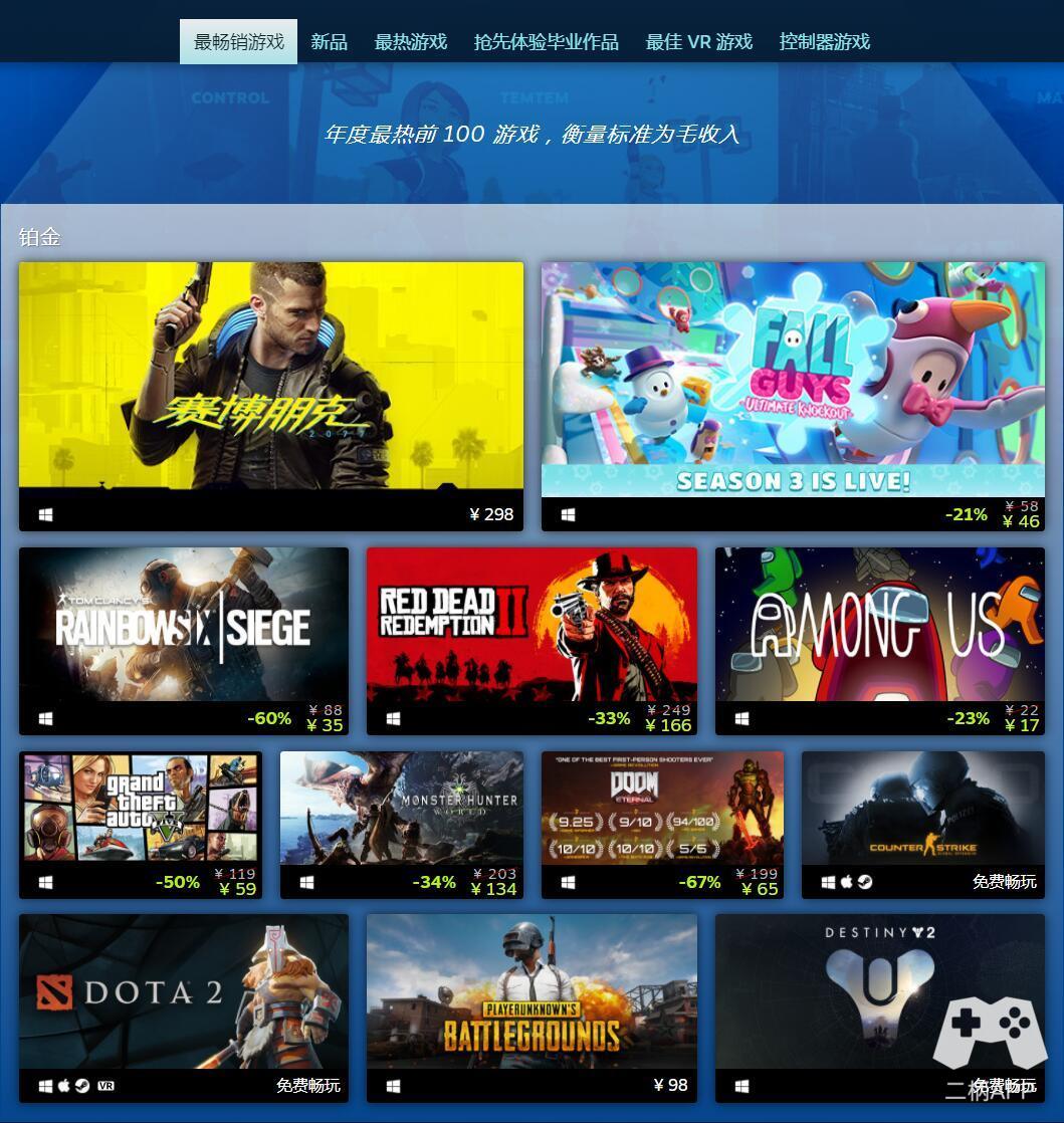 Steam官方今日发布了2020年Steam的最佳畅销游戏榜单,本次榜单分为最畅销游戏、最热新品、人气最高游戏、最佳EA毕业作品、最佳控制器游戏几个品类。通过对游戏收入的统计,筛选出了各个品类中最热门的一些作品,其中既有《赛博朋克2077》《荒野大镖客:救赎2》《糖豆人》这些新秀,也有《给他爱5》《绝地求生》这些老面孔。Steam冬季促销正在进行中,如果你还在考虑购入哪些游戏,不妨从下列榜单中挑几款热门作品~