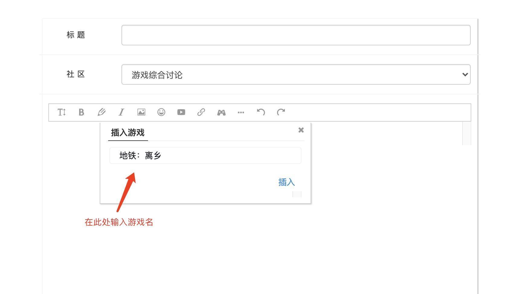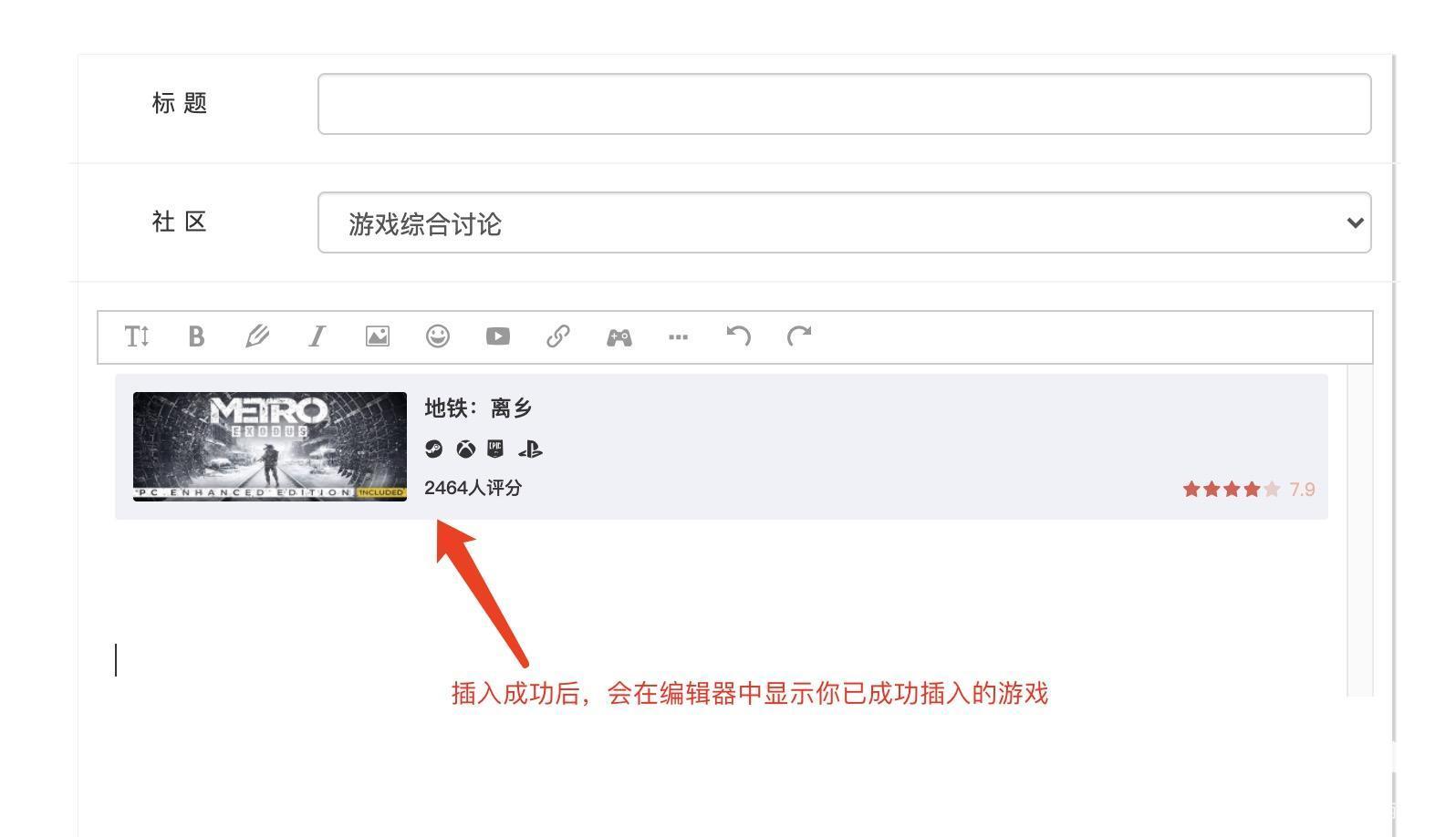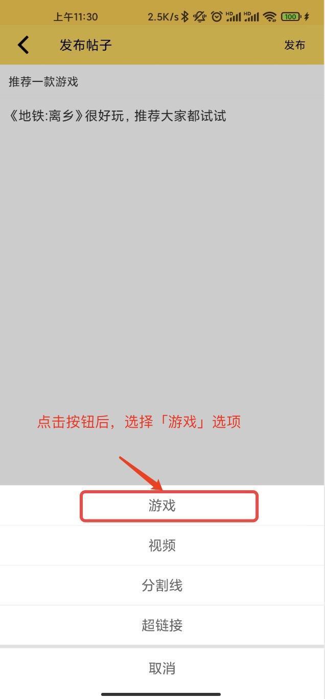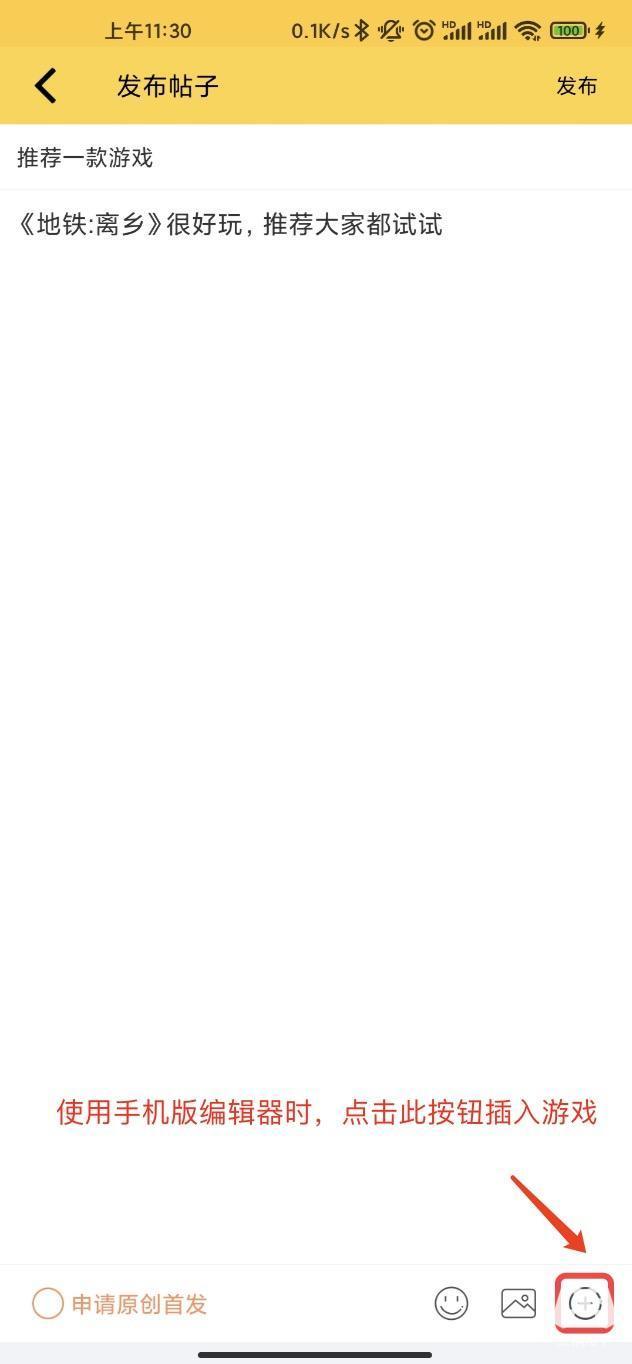 2、在发帖界面,点击「手柄」图标,插入游戏
