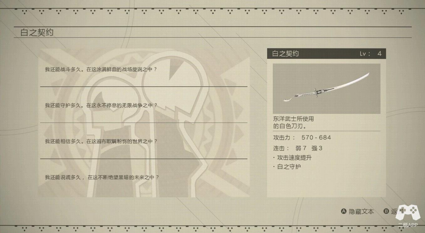 此器连段爽快,技能更是实用,搭配各种回血芯片可以做到长时间触发。白之契约的武器故事是2B的内心独白,侧面烘托出她的迷茫且脆弱的一面。