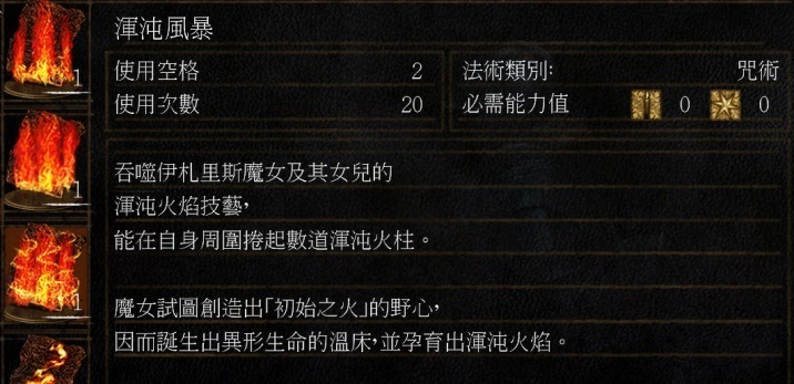 本作在武器故事方面不是太完善,只能简单读出此武器的描述。但是各种魂系列经典已经初见雏形,如恶魂魔女的黑暗魔法,成就了魂1大咒术师的我。
