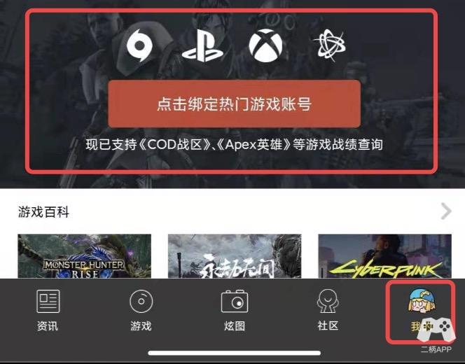 一、在二柄右下角找到「我的」,然后点击「绑定热门游戏账号」