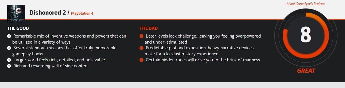 《羞辱2》首批媒体评分出炉《羞辱2》的首批媒体评分已经陆续出炉,Gamespot给出了8分的评价,认为《羞辱2》这部续作不只是故事上的延续,除了在一代的基础上增添了更多的武器,能力等,玩家还可以选择科尔沃和艾米丽分别进行游戏,游戏依旧保留了独具创意的潜行动作风格。除了Gamespot外,其他公布评分的媒体也基本都给了好评,认为本作是一款优秀的潜行游戏。