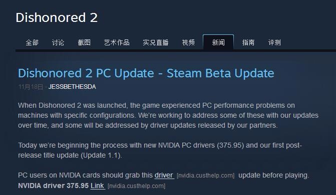 《耻辱2》1.1测试版补丁发布《羞辱2》发布后PC版糟糕的优化让玩家诟病,对补丁的呼声也越来越多。今日Bethesda发布了PC版的1.1测试版补丁,官方称针对AMD硬件以及CPU优先级进行了优化。注意这个补丁是测试版的,需要在Steam上开启测试版才可以获得更新。官方还推荐用户更新Nvidia的375.95版显卡驱动,或者AMD的16.10.2版显卡驱动。此外1.2版补丁将会进行更多的优化,还在开发中,尽情期待。但是从下面玩家的评论来看,似乎这个测试版1.1补丁效果不明显。
