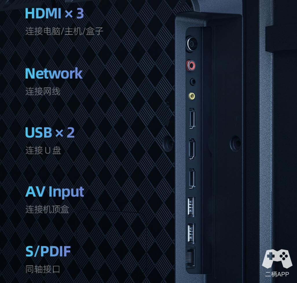 首先来看一下,电视的接口部分。电视侧面提供了3个HDMI接口,其中1个HDMI 2.1接口,2个HDMI 2.0接口。HDMI 2.1接口可用于PS5和Xbox Series这些新世代主机,以实现4K分辨率下120Hz刷新率的画面输出。