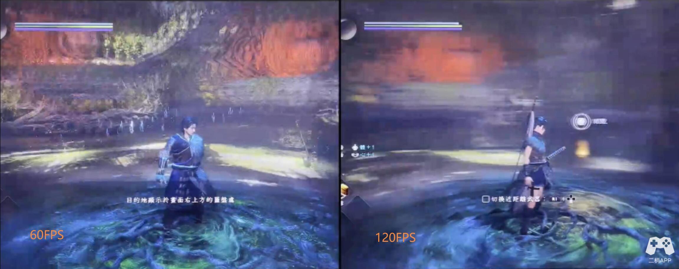 像是支持120FPS的《仁王2 Remastered》就能够在创维A33上获得120Hz高刷的优势。可以看到,在快速旋转人物周围环境的场景下,60FPS的画面可以看到更多重复的断层和拖影,而120FPS的画面则更加模糊。这意味着120FPS的画面在实际游玩的场景下不会给人有卡顿拖沓的感觉,在体验上更为流畅。