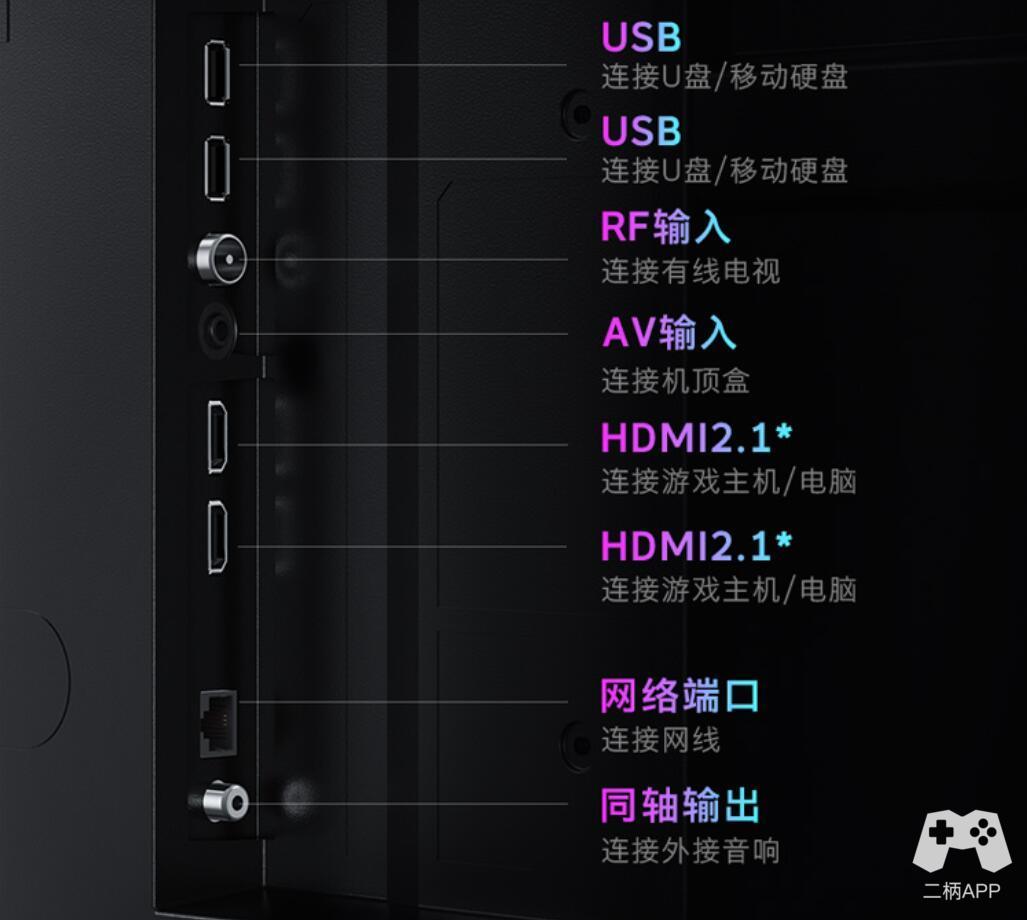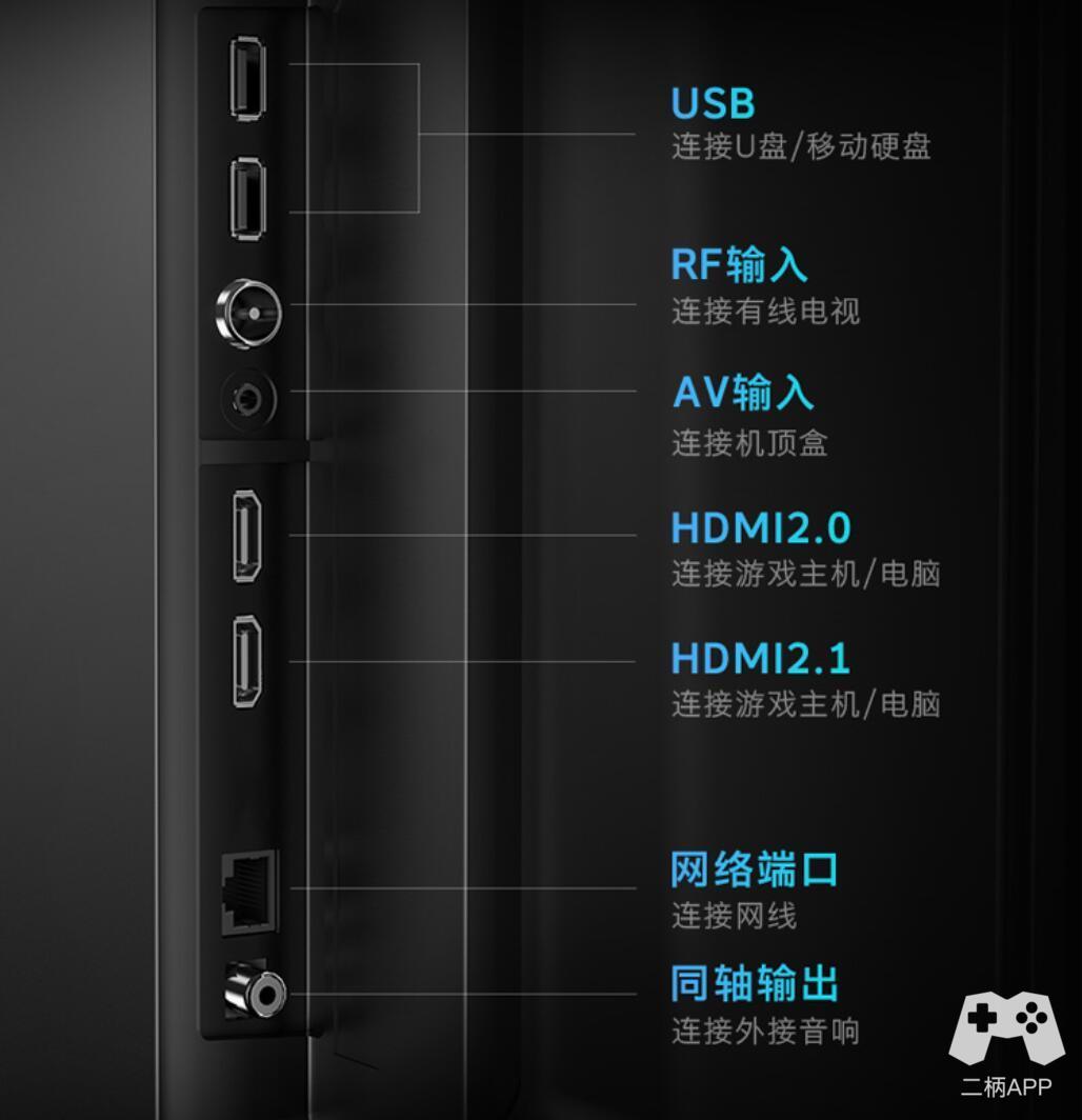 接口方面,配备了1个HDMI 2.1接口、1个HDMI 2.0接口,2个USB接口,同时还有常规的RF输入、AV输入、同轴输出等等。
