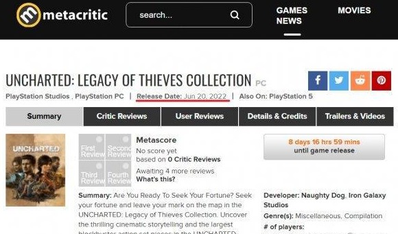 评分网站MC显示《神秘海域 盗贼合集》PC版6月20日推出