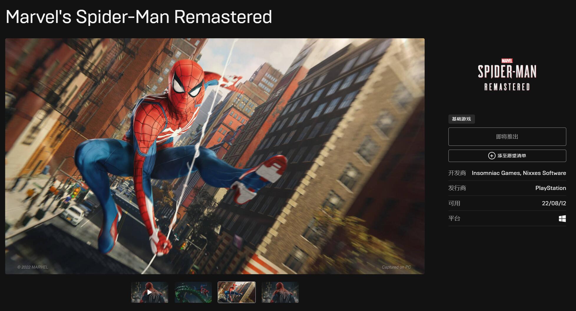 《蜘蛛侠 高清重制版》Steam/Epic页面上线,8月12日发售
