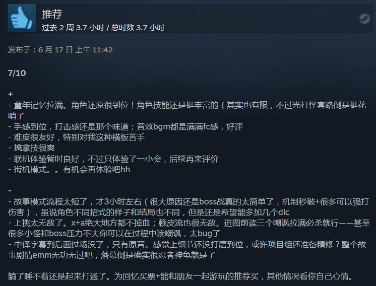 【《忍者神龟:施莱德的复仇》Steam获“特别好评”:手感不错,角色招式相当还原】《忍者神龟:施莱德的复仇》目前在Steam平台获得了“特别好评”的玩家评价,截止至目前的1305篇玩家评价中,好评率为92%。从评价来看,玩家们表示《忍者神龟》角色战斗招式在游戏中还是相当还原的,游戏的手感体验也比较不错;不过有玩家反馈线上联机模式的体验还有待优化,以及大招的平衡设计可能还需要进一步调整。