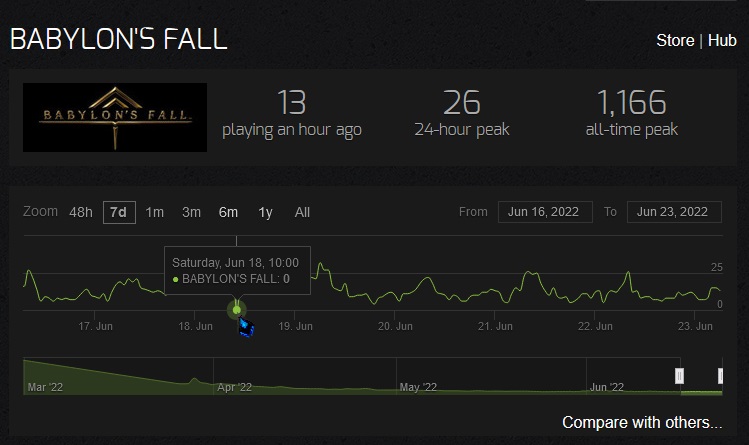 【“彻底陷落”的《巴比伦的陷落》,0在线人数成就达成】SE与白金工作室合作的游戏《巴比伦的陷落》自发售以来就备受指责,据第三方平台Steam Charts数据显示,在2022年6月18日10点,游戏在线人数为0!虽然之后又恢复了至少5人在线的情况,但对于游戏的声誉来说貌似已经跌到了谷底。尽管官方联动了人气IP《尼尔:机械纪元》,并且也承诺了后续内容(第三季正在制作中),不过似乎仍旧无法挽回游戏的人气。