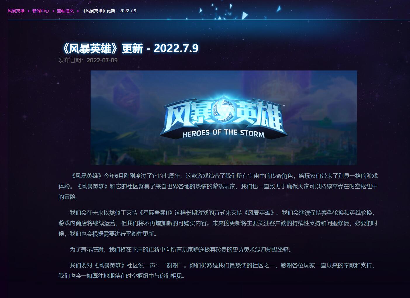 【《风暴英雄》官方确认将不再增加新的可购买内容】今日《风暴英雄》官网发布公告宣布,游戏今后将不再增加新的可购买内容。以下为公告原文:“我们会在未来以类似于支持《星际争霸II》这样长期游戏的方式来支持《风暴英雄》。我们会继续保持赛季轮换和英雄轮换,游戏内商店将继续运营,但我们将不再增加新的可购买内容。未来的更新将主要关注客户端的持续性支持和问题修复,必要的时候,我们也会根据需要进行平衡性更新。为了表示感谢,我们将在下周的更新中向所有玩家赠送极其珍贵的史诗奥术混沌蜥蜴坐骑。”《风暴英雄》是暴雪于2015年所发布的一款moba游戏,其中汇聚了旗下《魔兽争霸》《暗黑破坏神》《星际争霸》《守望先锋》等人气作品中众多经典的角色。