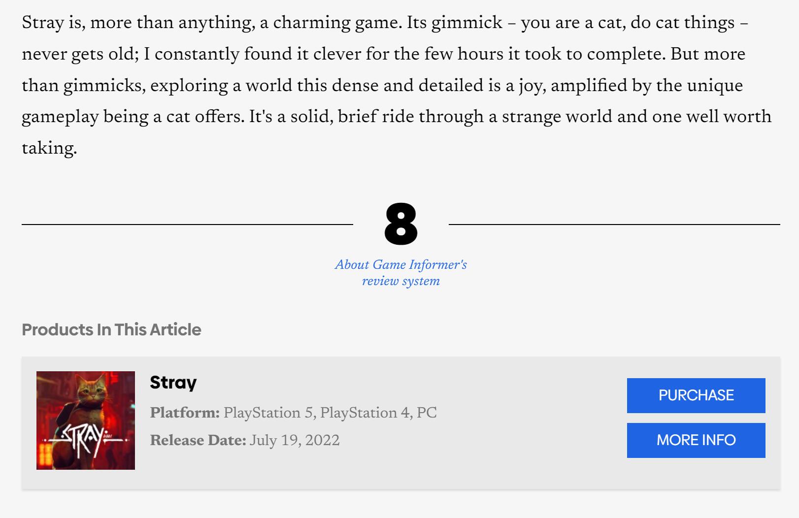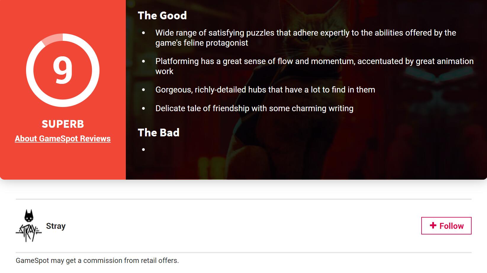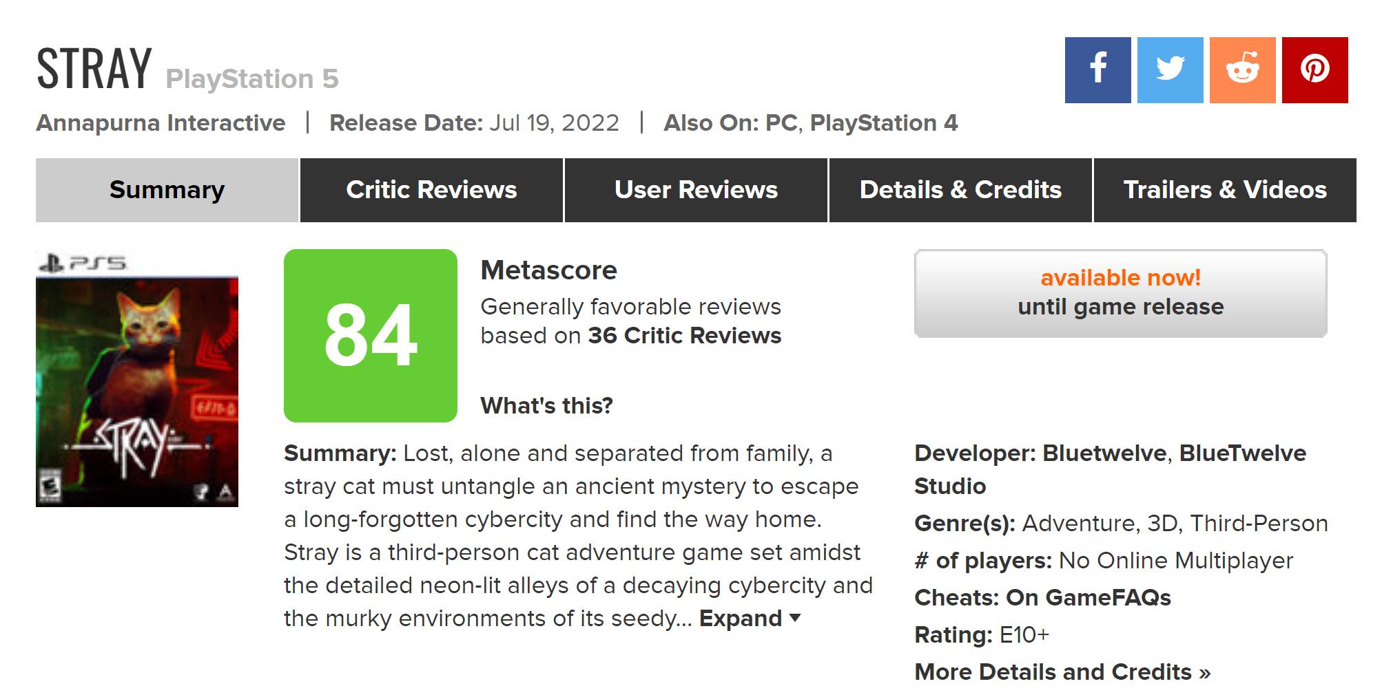 【《流浪》媒体评分解禁:IGN 8分 GameSpot 9分】猫咪主题冒险游戏《流浪》全球媒体评分已经出炉。IGN为本作给出8分评价,而Game Spot则给出9分,GameInformer同样给出8分评价。目前游戏在MC上的媒体均分为84分。