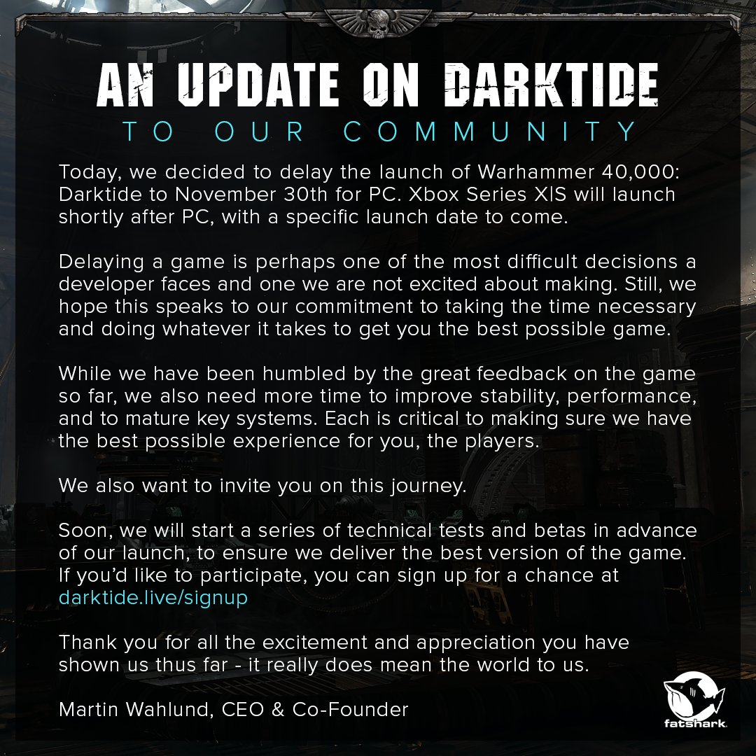 【《暗潮》跳票】为了尽可能的呈现最高品质的游戏表现,曾开发《战锤:末世鼠疫》系列的肥鲨工作室(Fatshark)多人合作新作《战锤40K:暗潮》宣布跳票,游戏的PC版将从原定发售日9月13日调整为11月30日,Xbox Series X|S版本则会在PC版发售后不久推出。