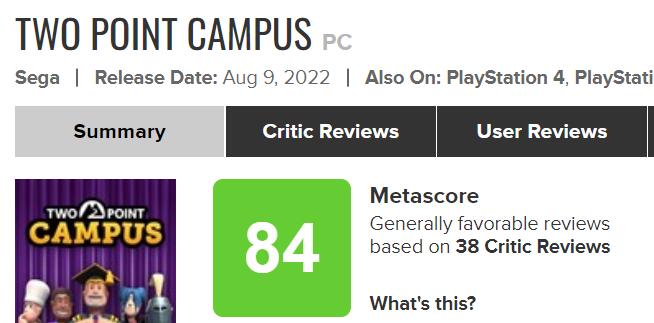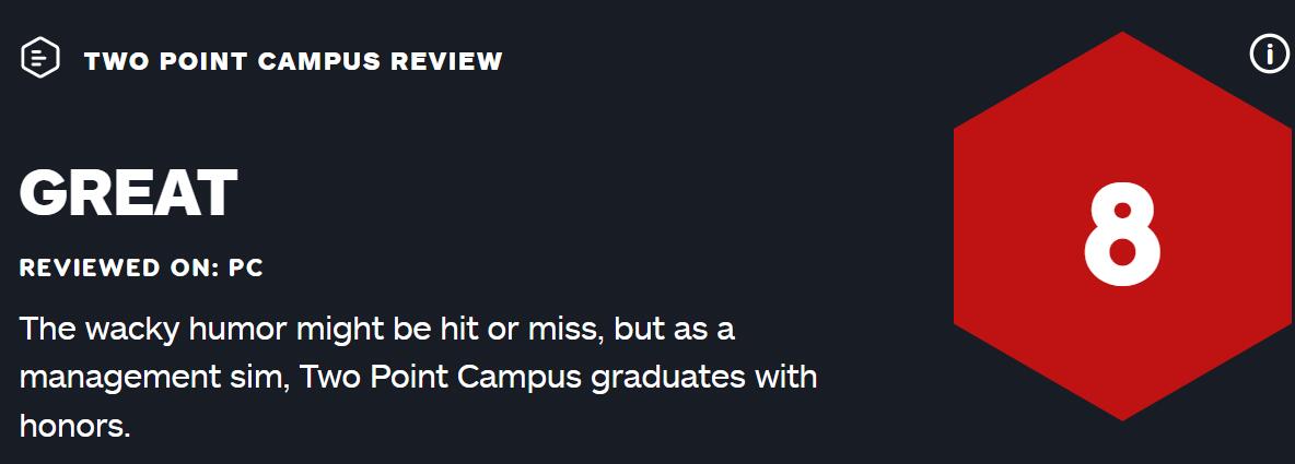 【模拟经营游戏《双点校园》获IGN/GS双8分评价】由Two Point工作室开放、世嘉发行的模拟经营游戏《双点校园》媒体评分已公布,其中IGN与GameSpot都给出了8分的评价,GameInformer给出了8.5分的评价,目前游戏PC版的MC媒体均分为84分(38家媒体评价)。