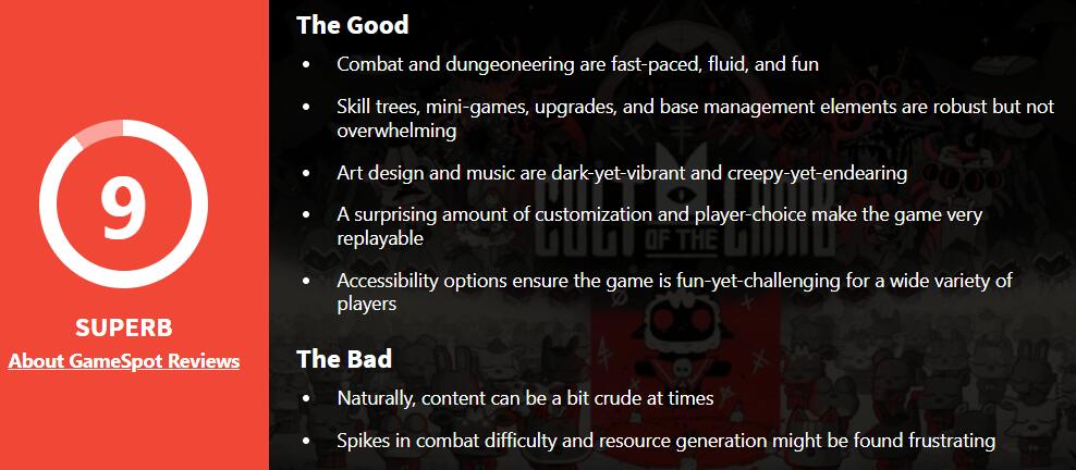 IGN认为本作既可爱又古怪,是各种游戏类型和主题的折衷组合。它的战斗系统差强人意,但是缺乏深度与变化,流程也相对较短,因此无法为玩家带来持久的吸引力。GameSpot认为本作是rogue-like游戏中的佼佼者,也其中一款非常独一无二的作品。无论玩家在探索地牢还是扩张阵营,所带来的体验都是令人愉快的、具有挑战性、甚至有点疯狂的。