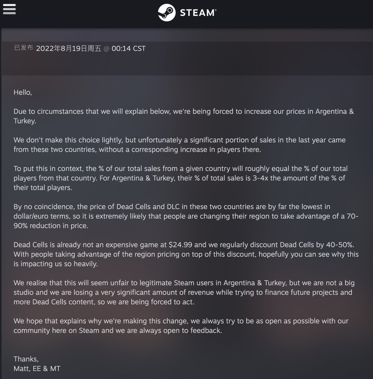 《死亡细胞》阿根廷及土耳其区涨价,官方表示迫不得已