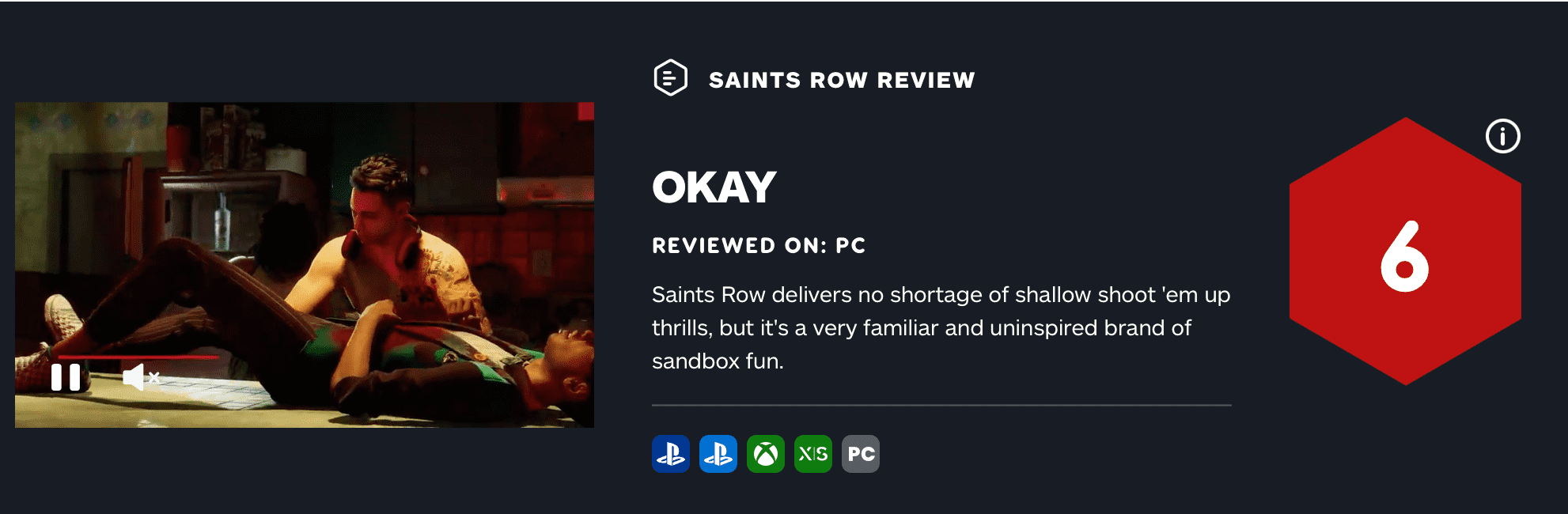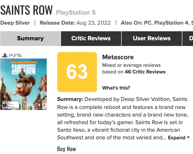 【《黑道圣徒》重启作获IGN与GameSpot双6分评价】由Volition开发的《黑道圣徒》重启作全球媒体评分已出炉。其中IGN与GameSpot均给出了6分,GameInformer则给出8.5分,目前游戏PC版在MC上媒体均分为69分(16家媒体评价),PS5版媒体均分为63分(43家媒体评价)。