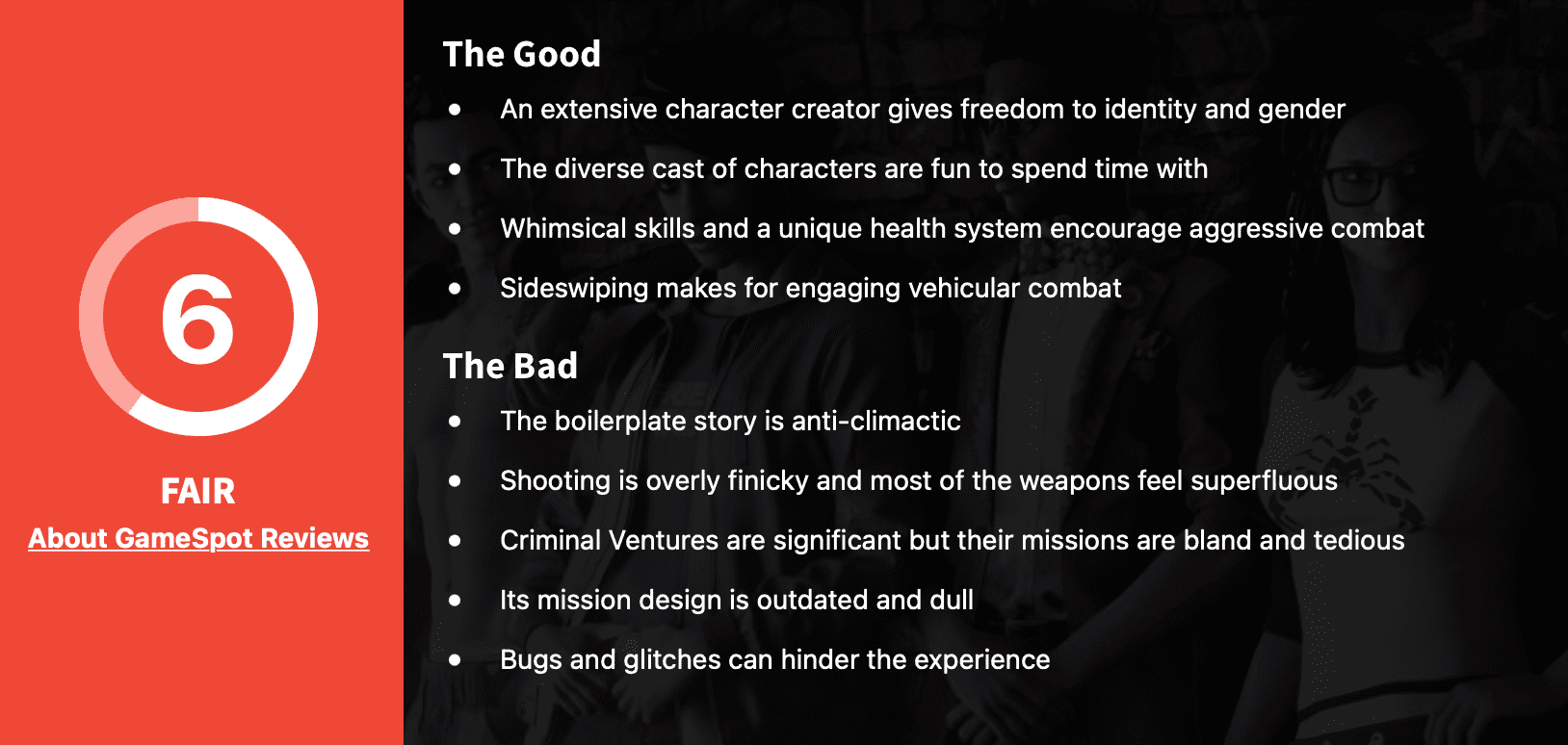 《黑道圣徒》重启作获IGN与GameSpot双6分评价