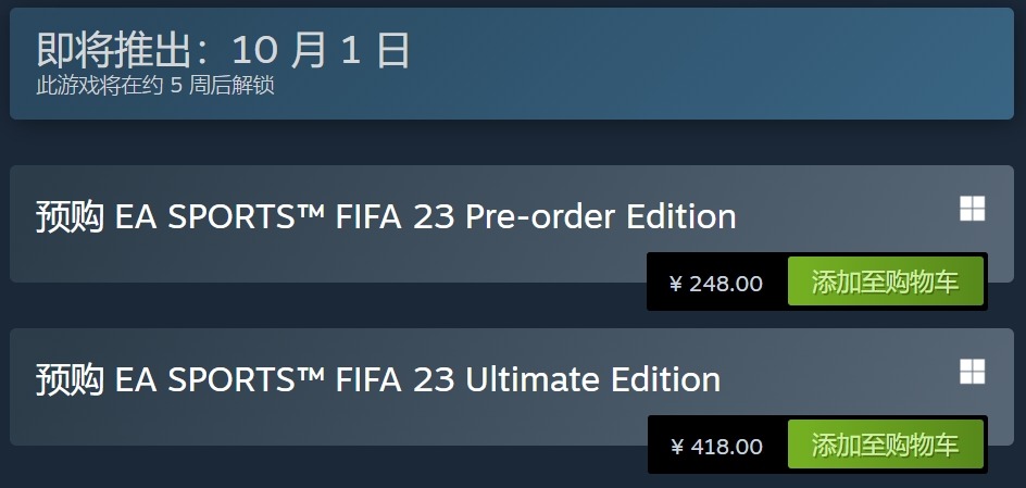 Steam《FIFA23》终极版售价重新涨回418元