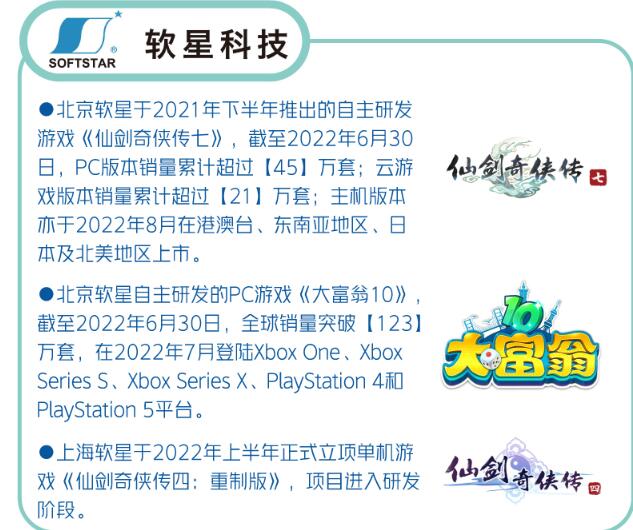 【上海软星《仙剑奇侠传四:重制版》正式立项,并已进入研发阶段】今日中手游公布了2022年的中期财报,根据财报显示: 1、上海软星《仙剑奇侠传四:重制版》已在2022年上半年正式立项,并已进入研发阶段。 2、截止2022年6月30日,《仙剑奇侠传七》PC版销量累计超过45万套,云游戏版销量超过21万套。 3、截止2022年6月30日,《大富翁10》PC版销量累计超过123万套。