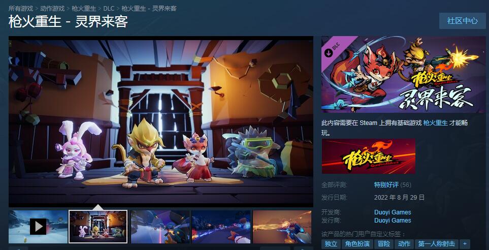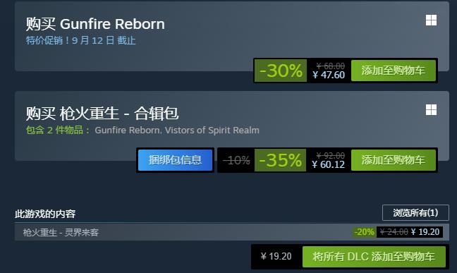 【《枪火重生》首个DLC“灵界来客”推出,同时带来新模式“怪奇梦境”】《枪火重生》首个DLC“灵界来客”目前已在Steam平台推出,DLC包含两个新英雄“璃”、“行者”,以及四把新武器“织云”、“弧光”、“雷刹”、“六方”,DLC“灵界来客”原价24元,首周折扣价19.2元;游戏本体也同步开启了持续两周的折扣促销,原价68元,折扣价47.6元;此外还有枪火重生 合辑包(本体+DLC)优惠价60.12元。