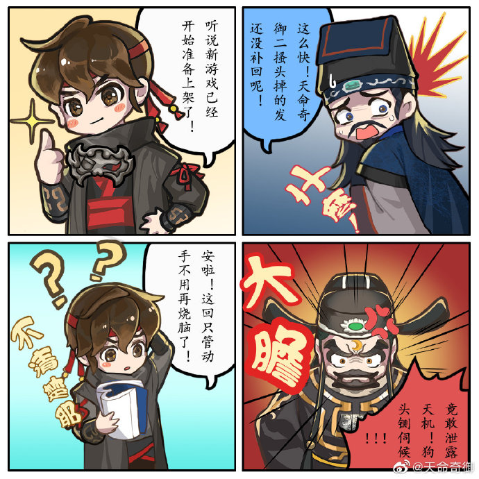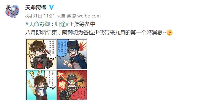 【“天命奇御”新作《天命奇御:归途》上架筹备中】《天命奇御》官博时隔两个半月再次发布博文,内容为一幅四格漫画。开发商甲山林娱乐也在这篇博文中表示“《天命奇御:归途》上架筹备中”,同时漫画中还提到了“这回只管动手,不用再烧脑了”。据此前官博公布的消息来看,新作《天命奇御:归途》可能会采用肉鸽模式玩法。