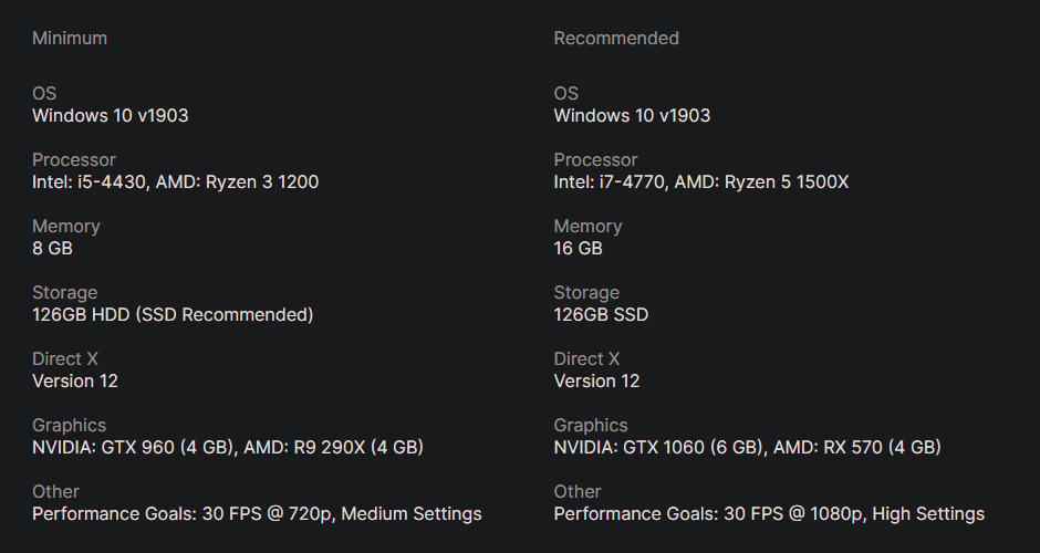 CPU:Intel: i5-4430, AMD: Ryzen 3 1200