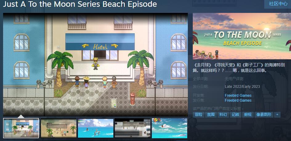 【《去月球》《寻找天堂》《影子工厂》海滩特别篇游戏公布】《去月球》《寻找天堂》《影子工厂》海滩特别篇《不过如此的去月球系列海滩特别篇》Steam页面现已上线,预计将于2022年底~2023年初期间发售。以下为游戏Steam页面简介:准备好参加这场新颖又短暂旅程吧,作为西格蒙德公司的员工,公司报销请大家去金龙虾度假旅店享受足足一整天的假期!不过公司显然也就付得起这么多了。与《去月球》《寻找天堂》和《影子工厂》的老面孔们结伴远游,一起畅玩精彩纷呈、扣人心弦、老少咸宜的小游戏,当然还有……等等,这里的大部分角色应该都不在人世了。