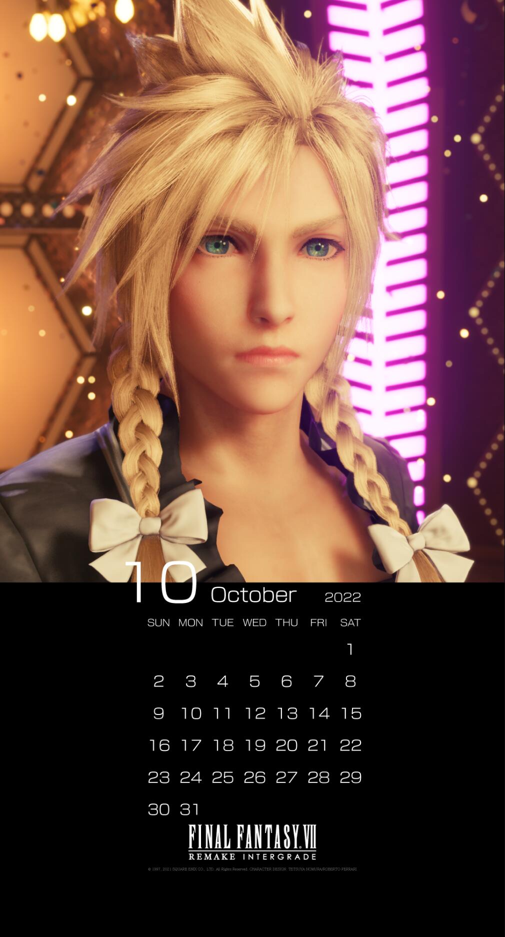 【《最终幻想7 重制版》发布女装克劳德10月日历壁纸】《最终幻想7 重制版》的官方账号带来了三张适用于PC及手机的10月桌面壁纸,不知道各位玩家们觉得是戴了金色假发的克劳德漂亮还是蒂法漂亮呢?你会选择谁?