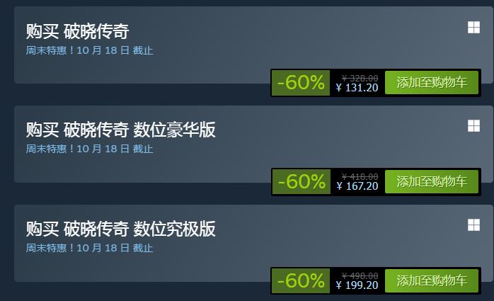 《破晓传说》60% OFF优惠,折后价131.2元,新史低价。