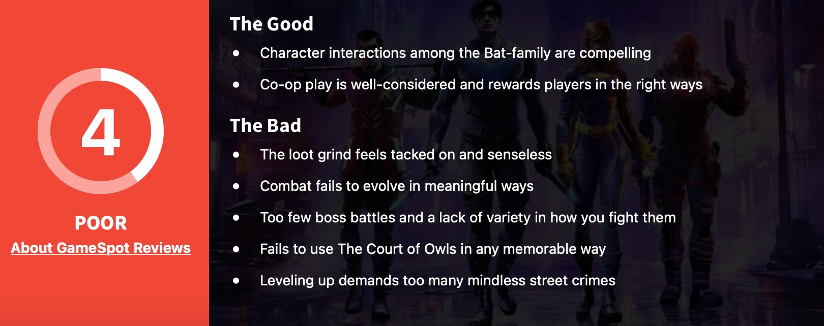 GameSpot认为蝙蝠家族之间的角色互动颇具吸引力,合作游戏设计也经过深思熟虑,能给予玩家适当的奖励。但战利品挑战折磨且毫无意义,战斗机制的发展走错了方向,Boss战斗数量过少并且缺乏多样性。反派组织“猫头鹰法庭”也没能给人留下深刻的印象,而且等级提升需要完成太多无趣的街头犯罪事件。