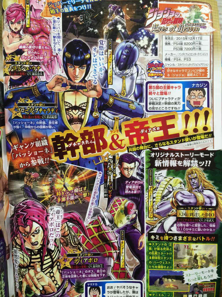 根据JUMP偷跑杂志图获悉,《JOJO 的奇妙冒险》第五部的角色“特里休·乌纳”将确认参战《JOJO 的奇妙冒险:天堂之眼》!此外本作中的故事剧情模式将由原作作者荒木飞呂彦亲自监制,并且收录《JOJO 的奇妙冒险》的第1部~第8部的角色。本作将于2015年12月17日正式发售。