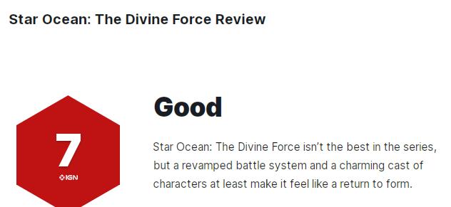 其中IGN评语为:《星之海洋6》在整个系列中虽然算不上最佳,但和前作相比制作团队还是努力地将其打造成了一个符合当下的合格之作。调整后的战斗系统不仅带来了前所未有的自由度,在灵活性上也有着很大的突破。此外,角色的塑造也非常不错,即便配上僵硬的动画演出也能感受到人物们身上的魅力。但是游戏的界面问题就有些难以令人接受了(如字体过小等)。总的来说,本作至少证明了SE再次尝试挑战科幻题材JRPG游戏还是值得的。