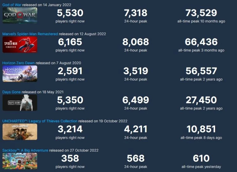 【《麻布仔大冒险》PC版表现不佳,最高在线人数仅610人】根据SteamDB提供的数据,10月27日发售的《麻布仔大冒险》PC版目前来看并不是很成功,游戏同时在线玩家数峰值只有610人。虽然《麻布仔大冒险》在索尼第一方游戏阵容中相对于其他作品并不算大制作,但数据相差的也过于悬殊。其中《地平线:零之曙光》首发峰值为56557人,而《漫威蜘蛛侠》则有66436人,《战神》更是达到了73529人,新推出的《神秘海域合集》首周也有着10851的最高在线人数。