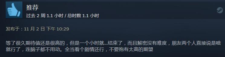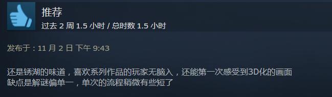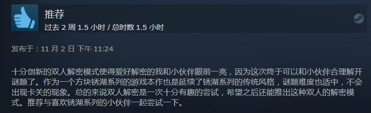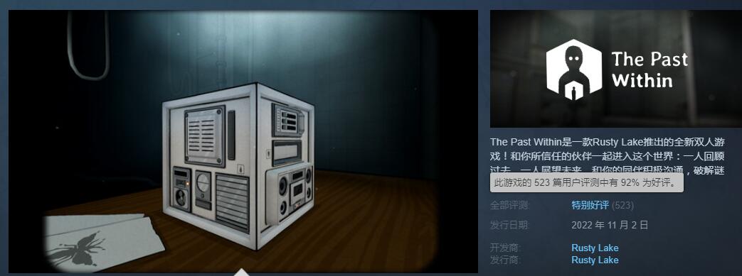 【锈湖双人合作解谜新作《The Past Within》Steam获“特别好评”】锈湖系列双人合作解谜新作《The Past Within》现已正式发售,目前游戏在Steam的玩家好评率为92%,游戏总评为“特别好评”。从玩家评价来看,全新的3D空间解谜以及双人合作玩法,带来了新颖的游戏体验;不过游戏时长较短,以及作为解谜游戏来看,游戏整体难度不高。
