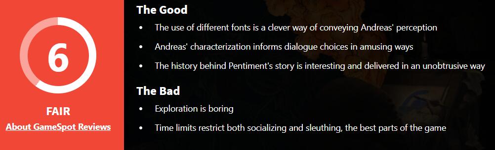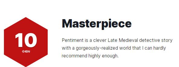 IGN认为,游戏中对中世纪晚期历史细节的呈现,搭配上难以直接得到答案的巧妙侦探故事,让《Pentiment》这款作品登峰造极。游玩过程中,它的缺点微乎其微,甚至给人想至少再玩一两次的冲动,以探索一周目没有走过的路。本作从未因其简单性、缺乏战斗或传统谜题而受到影响,因为它完美地将玩家带入其华丽且负责的现实世界之中,并激发了玩家想要了解人们过去种种情况的热情。